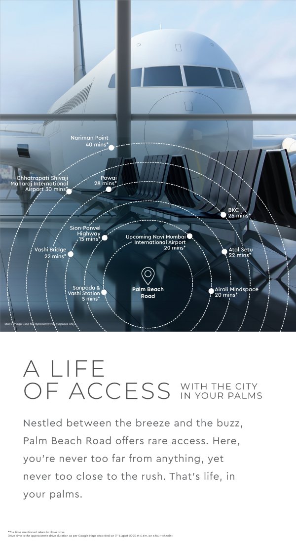 Palm Beach Road isn’t just Navi Mumbai’s most sought-after address. It’s where serene views meet seamless connectivity. With highways, bridges, and business hubs close by, everything you need is within easy reach, without the rush. It’s urban convenience in the palm of your hand.